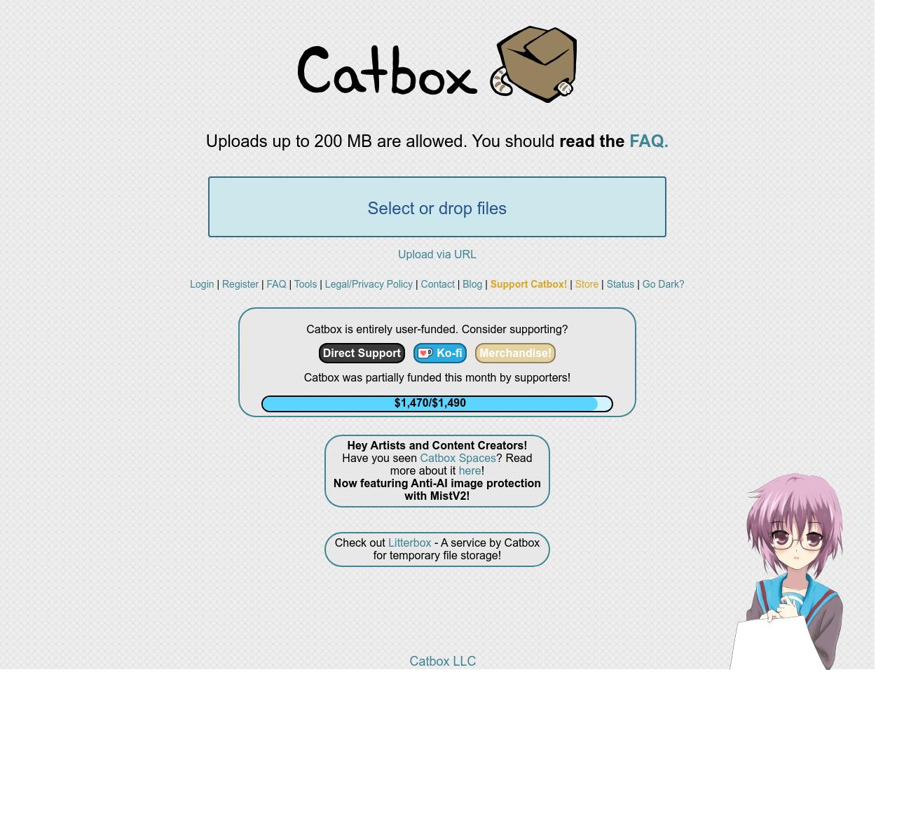 Catbox is entirely user-funded, with donation levels displayed on its homepage. catbox.moe